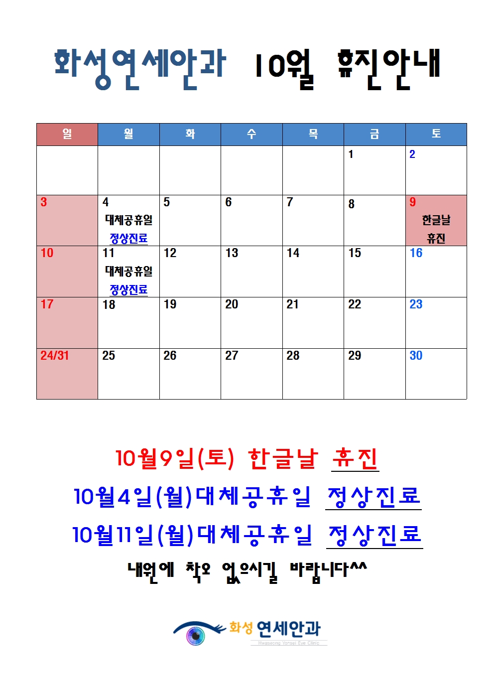 화성연세안과 10월 휴진안내입니다^^