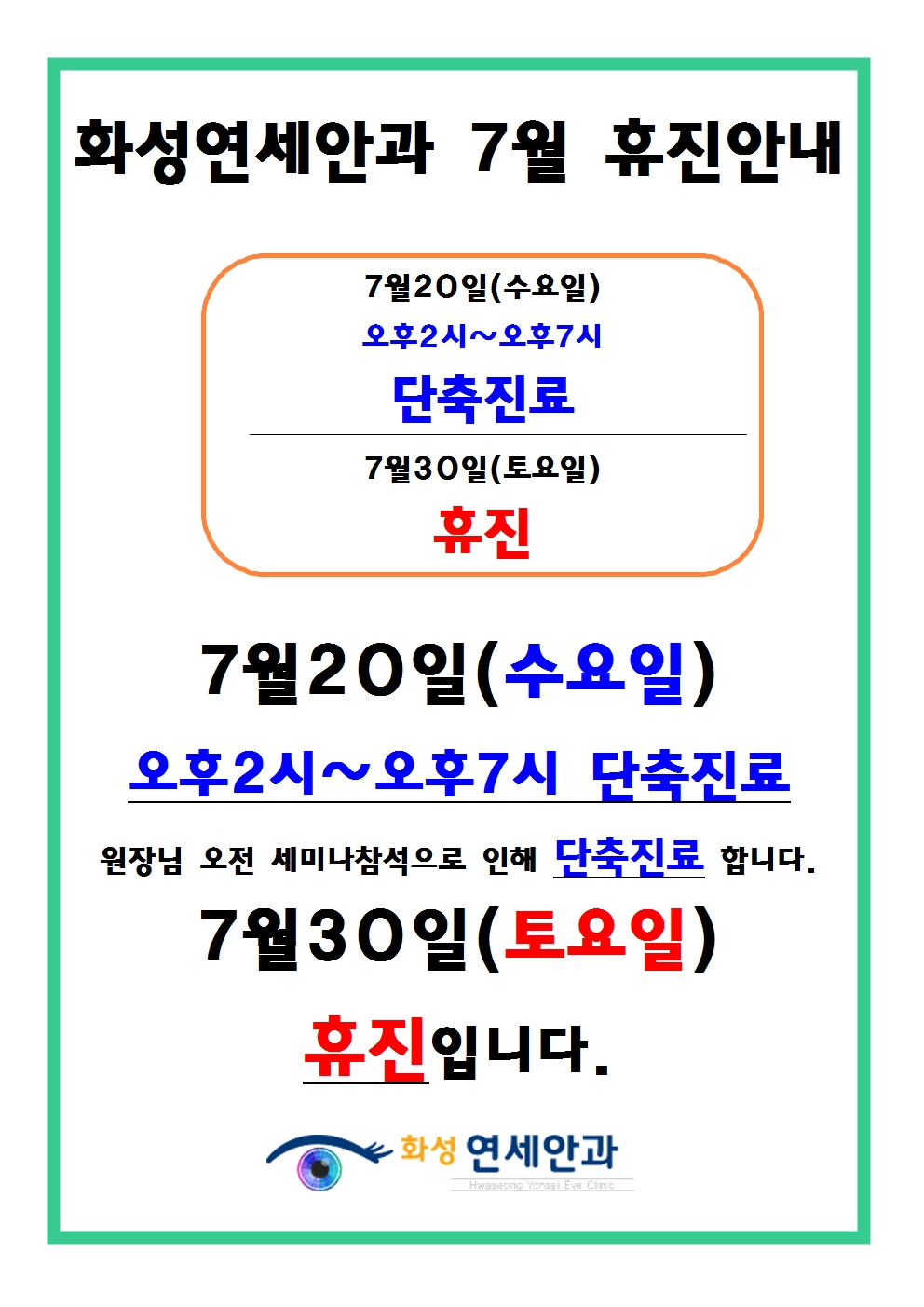 화성연세안과7월휴진안내입니다
