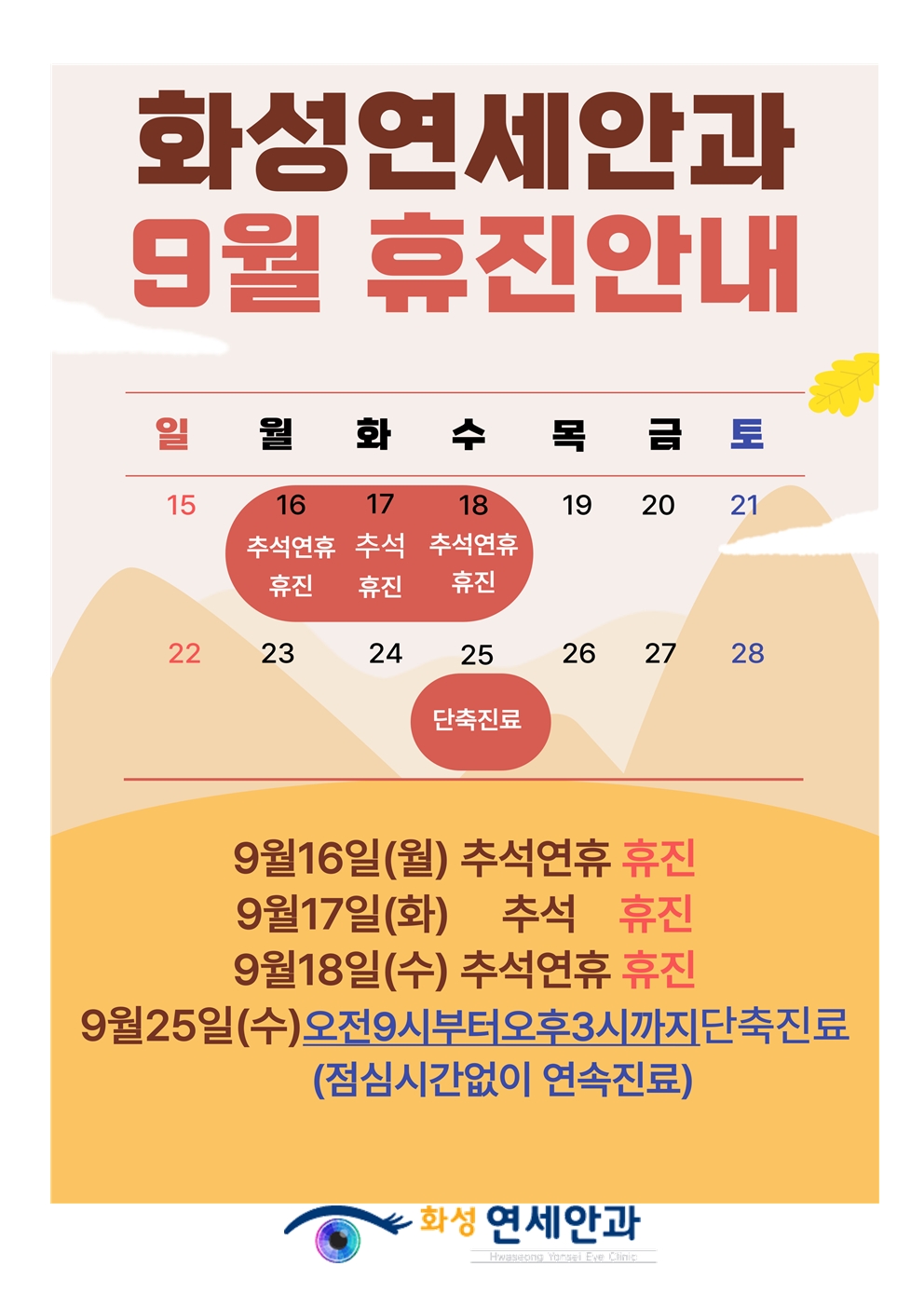 화성연세안과 9월 휴진 및 단축진료 안내입니다^^